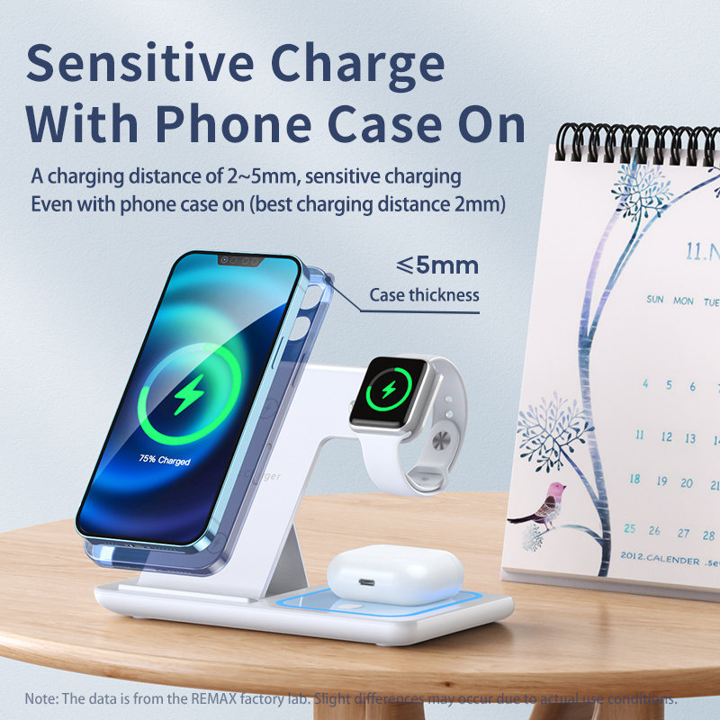 Combines three chargers into one. Saves space and eliminates desk clutter• Ideal gift for tech lovers, students, and professionals• Works with most phone cases (≤5mm thick, no metal attachments)• Supports both portrait and landscape viewing